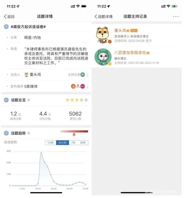 孫宇舉了4月7日#龔俊方起訴造謠者#的例子,話題原本的主持人是@八百里加急販賣社,而後換成了@重頭戲,該賬號曾在其他熱搜話題中被@新浪大文娛置頂。