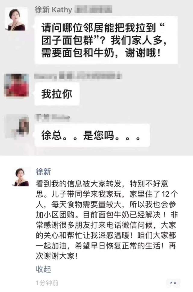 風投女王徐新在上海某業主羣裏請求鄰居幫忙拉羣,給家人搶購麪包和牛奶。隨後其在朋友圈回應,兒子帶同學來家玩,家裏住了12個人,每天食物需求量較大,所以才參加小區團購,目前面包牛奶問題已經解決。徐新還對大家的關心和幫忙表示感謝,並勉勵大家一起加油,早日恢復正常的生活。