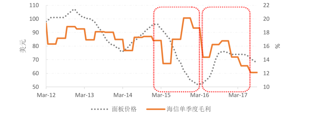 反倒是作為製造業微笑曲線的底部,對於電視廠商來説,上游面板漲價帶來波動才是最為致命的。以海信為例,根據平安證券2018年發佈的家電行業數據顯示,家電企業品牌的毛利率往往和上游面板價格呈現直接負相關反饋。