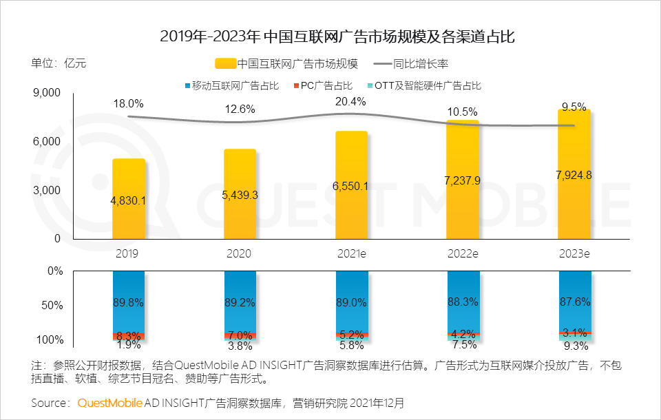 根據QuestMobile發佈的《2021年中國互聯網廣告市場洞察大報告》數據顯示,2019年到2021年,OTT及智能硬件廣告渠道佔比超越PC廣告渠道,從2019年的1.9%增長至2021年的5.8%,預計到2023年,這一數字更是將逼近10%左右。