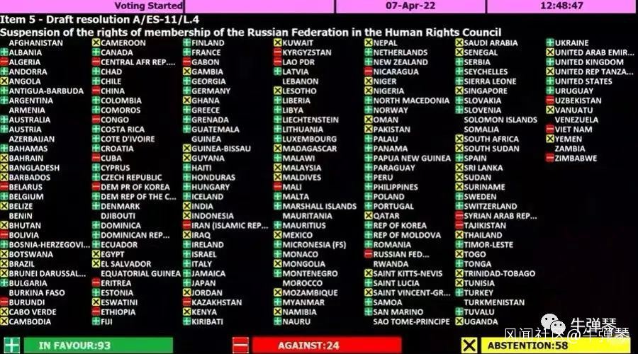 聯合國大會4月7日進行表決,審議暫停俄羅斯在人權理事會的成員資格。結果,93個國家贊成,24個國家反對,58個國家棄權。