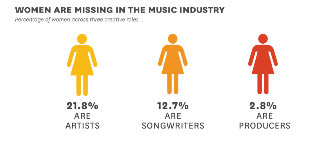 《Inclusion in the Recording Studio?》報告顯示,在以Billboard“Hot 100”年度榜單為依據的統計中,2012-2021過去10年間最受歡迎的1000首歌中女性音樂人的參與比例。結果顯示,在這1000首歌曲中,共涉及1977位音樂人,男性音樂人與女性音樂人的比例為3.6:1,其中參與詞曲部分的女性比例為12.7%,而在近700首歌製作環節的男女比例更是達到了驚人的35:1。而2012、2015、2017-2021七年中,參與“Hot 100”歌曲製作的女性比例甚至不足3%。