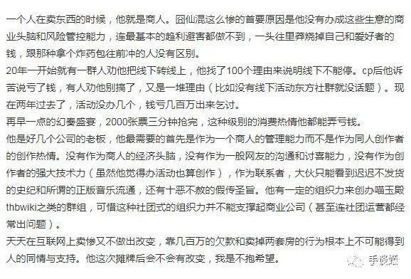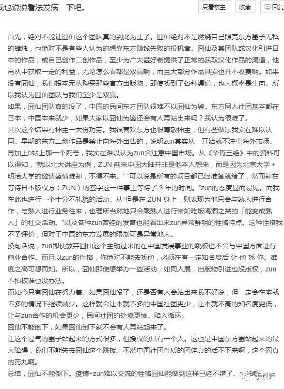 不過也有人覺得,囧仙既然已選擇將愛好變商業化,脱離了用愛發電的範疇,那就得為自己的選擇負責。大家支持的是東方本身,而非東方的意見領袖。既是同人活動,便會有愛好者們出頭,長期由一位官方代理人來主導是一件非常稀奇古怪的事情