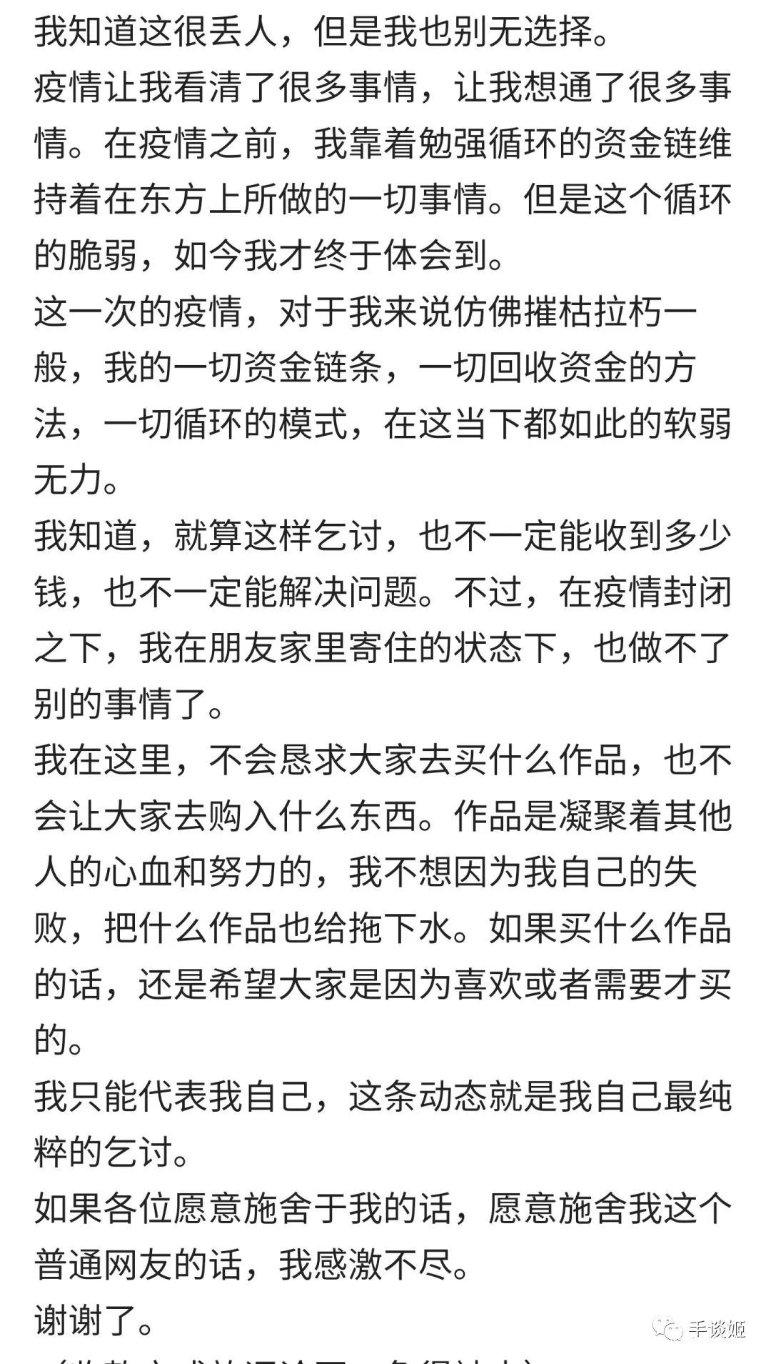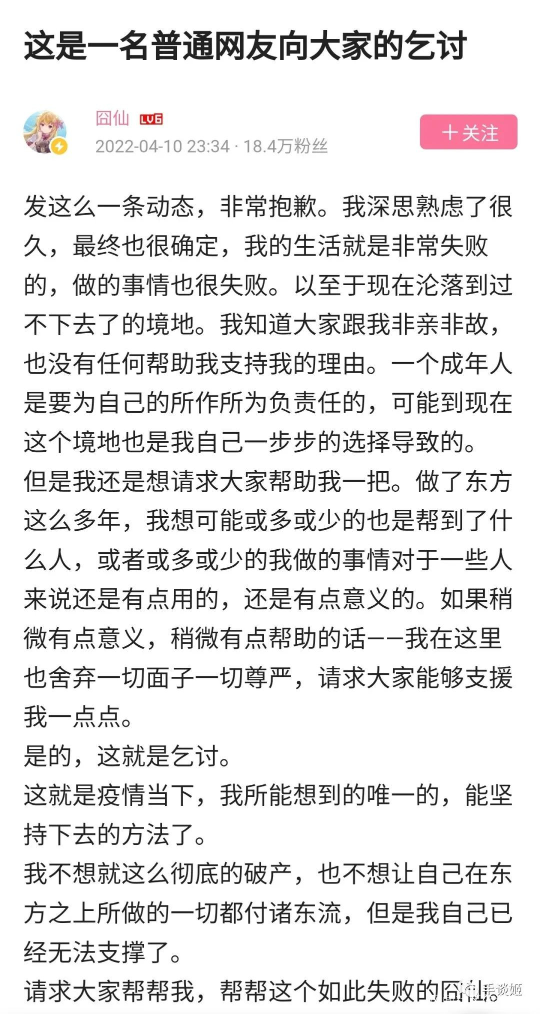 在這份乞討中,他表示因為疫情,自己快破產了,所以只好放下面子,請求網友的幫助。