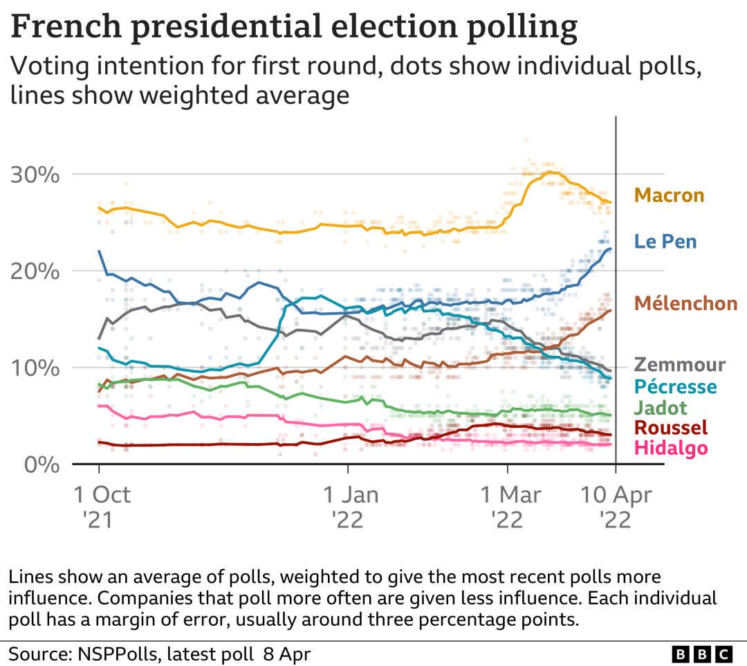 在俄烏危機爆發後,遲遲不肯宣佈正式參選的馬克龍和許多歐洲的政府首腦一樣,得到了一些“聚旗效應”(Rally ‘round the flag effect)的紅利,他看準時機,在臨近最後期限前正式公佈參選。由於塑造出了一個強大的、可以處理當下國家危機的形象,他的支持率一度高歌猛進,在短短几天內就從25%上升到30%左右,遠遠勝過了當時尚在17%左右徘徊的勒龐和在14%附近的澤穆爾,以至於有不少評論家都認為,馬克龍應該可以較為輕鬆地取得連任。