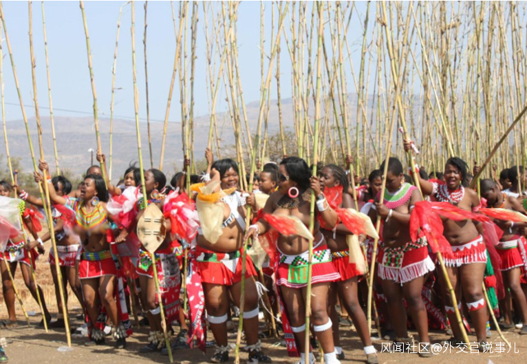 湛藍的天空飄着朵朵白雲,陽光明媚,春風盪漾,來自世界各地的遊客早已站滿道路兩旁。只見祖魯王手中的權杖向前一指,現場頓時鼓樂齊鳴,羣情激奮,山丘的坡路上開始塵土飛揚,歌聲響亮,一個接一個由少女手舉着蘆葦組成的方陣,列隊向我們走來,每個方陣各有一百人不等,她們全部都赤裸着上身,只穿着五彩短裙,載歌載舞,熱情奔放,都想在國王面前展現自己的風采。
