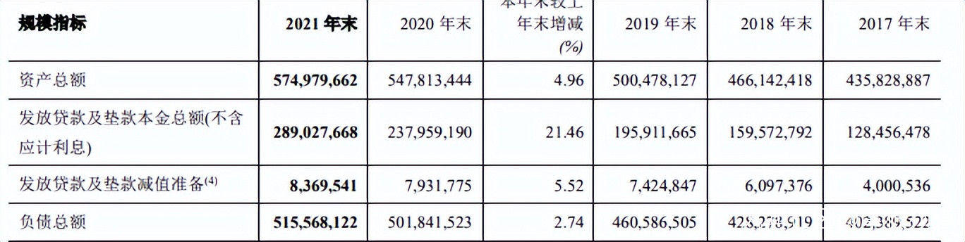 1.以總資產來説,截至2021年末,總資產為5749.80億元,較2020年末有4.96%的增幅。不過,從往年財報數據來看,2019年與2020年,該行總資產分別為5004.78億元和5478.13億元,增速為9.46%。