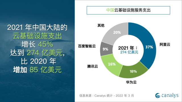 Canalys日前發佈的2021年中國雲計算市場報告顯示,中國雲基礎設施市場規模已達274億美元,由阿里雲、華為雲、騰訊雲和百度智能雲組成的“四朵雲”佔據80%的中國雲計算市場,穩居主導地位。
