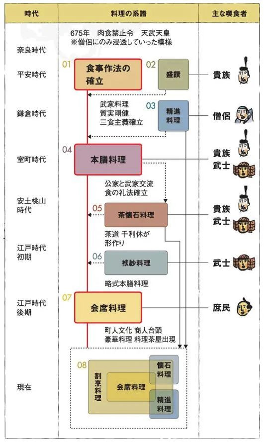 中國貴族流行的喝煮酒、就青梅,被改成了更容易保存和運輸的,用蒸餾酒和青梅泡製的梅子酒;中國貴族流行的點茶、分茶,被省略掉了製作工藝要求高的茶瓶,改用更容易製作普及的茶釜茶碗,並增加了精神層面的“侘(わび)”,成了日式茶道;中國貴族流行的複雜的肉膾、魚膾,在天武天皇頒佈的一紙“禁肉令“之後,縮減成了只有海魚肉的刺身……