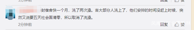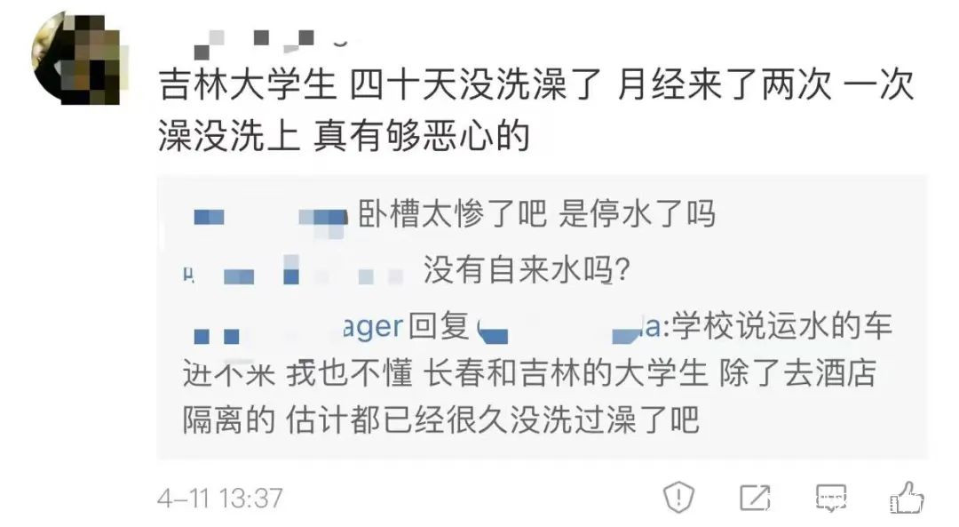説是因為大學設施老舊,他們學校洗澡的熱水是從外面買來的,但現在因為疫情封路,運水的車進不來,所以就洗不上澡。