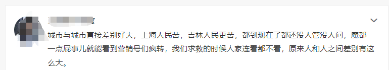 捫心自問,上海雖然天天捱罵,但也獲得了全國各地的支援,而且在上海的人求救能被看到,被各種瘋轉,其他地方就不一定有這個待遇了。