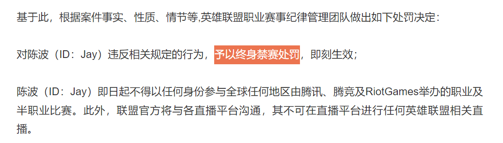 對於上述調查結果聯盟判定,Jay的行為不僅違反了《2022賽季英雄聯盟職業聯賽比賽規則》中第11.1.1.1條涉及假賽、第11.3條涉及賭博,且在調查過程中消極配合(第11.2.5條配合調查),遂對其處以終身禁賽,且終身不可從事任何英雄聯盟相關直播的處罰。