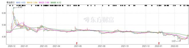 然而,年報中展現的成績無法掩蓋其股價自上市後便一路狂跌、震盪下行的事實。除了2020年12月月初出現了較大幅度上漲之外,3年以來青島銀行的股價都是在4.59元/股上下波動,常年跌破首發價。4月11日,還出現過3.99元/股的低價。