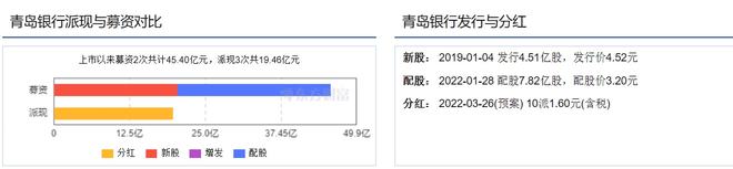 2022年1月,青島銀行完成A股配股發行,每10股配3股,配股價3.2元/股,募資總額25.02億,募資淨額24.81億。2022年2月,完成H股配股發行。A+H兩地配股項目發行合計13.1萬股新股,此次配股募資41.96億元,扣除發行費用後全部用於補充本行核心一級資本,核心一級資本充足率較上年末提升1.46個百分點,註冊資本由人民幣45.1億元增至人民幣58.2億元。