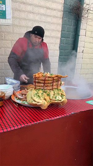 這道美食一般都是由羊肚包裹成球形,店家會在你吃之前幫你切成小塊,撒上秘製的辣椒汁和香菜,實屬色、香、味、趣俱全!