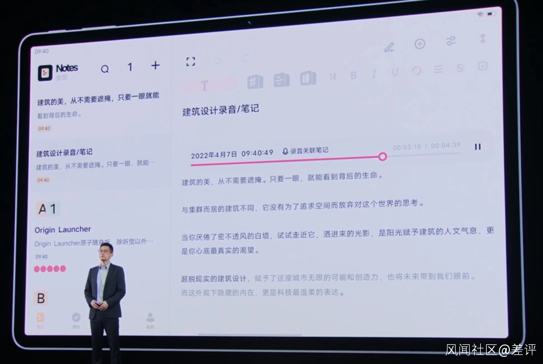 至於平板最重要得筆記操作交互, vivo 也是借鑑了三星,比如像通過錄音時間戳,把錄音內容和筆記內容一一對應,託尼覺得這還蠻新穎的。