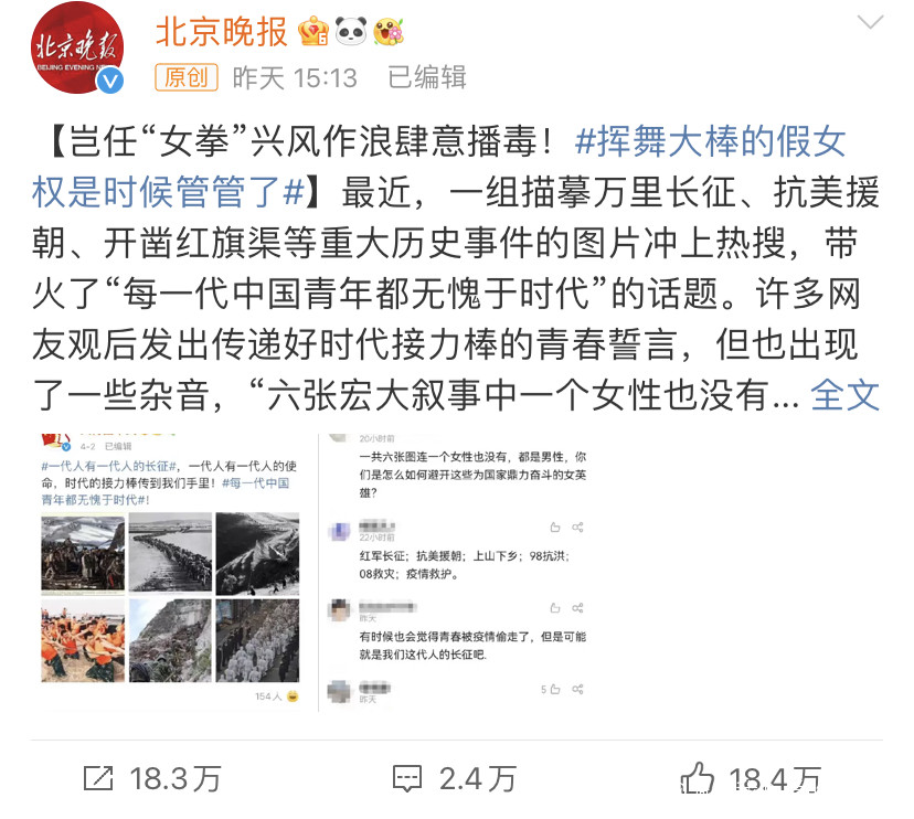 最近,一組描摹萬里長征、抗美援朝、開鑿紅旗渠等重大歷史事件的圖片衝上熱搜,帶火了“每一代中國青年都無愧於時代”的話題。許多網友觀後發出傳遞好時代接力棒的青春誓言,但也出現了一些雜音,“六張宏大敍事中一個女性也沒有”“婦女不配嗎呵呵”。陰陽怪氣的腔調,讓人異常反感。