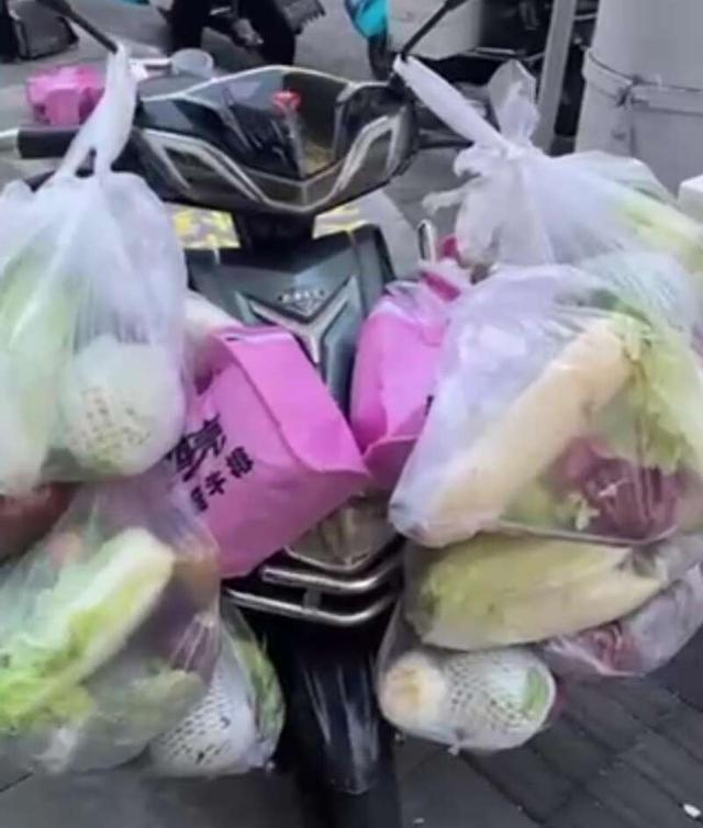 這幾天,我每天都要接100多單,從早上7點半開始一直忙到晚上11點。運送物資最多的一次,我的車上前前後後掛了25單商品,我甚至連電瓶車的後視鏡也沒放過。掛上了些比較輕的袋子。