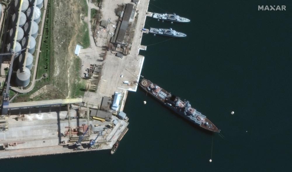美國發布4月7日衞星照片顯示停泊在克里米亞半島塞瓦斯托波爾港口,距離西面烏克蘭控制的敖德薩沿岸約300公里,距離北面烏克蘭控制陸地約三百公里。