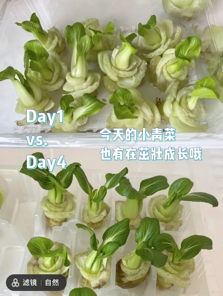 (水培青菜的第1天VS第4天;圖源:小紅書 @小啊辛x)