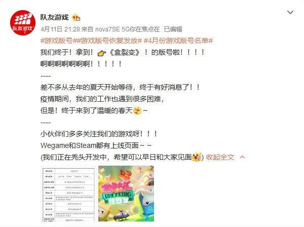 版號時隔263天后重新開始發放,對於遊戲行業來説確實是難得的好消息,心動CEO黃一孟在社交媒體上歡呼“國內版號終於開閘了,淚大喜奔”。獲得版號的遊戲工作室們也紛紛通過各種方式向玩家傳達他們的喜悦,《盒裂變》的開發商隊友遊戲發微博説,版號重新發放後,“終於來到了温暖的春天”。