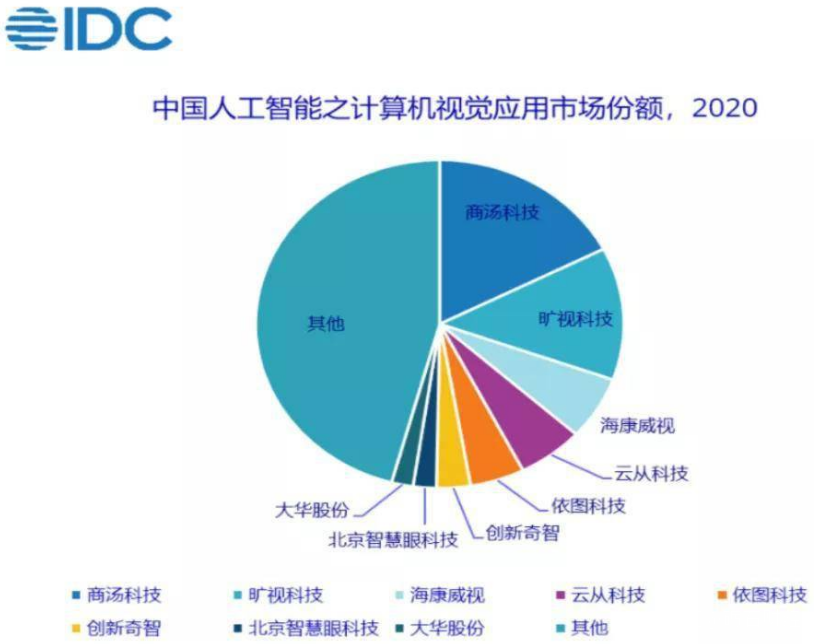 **在計算機視覺領域,商湯科技、曠視科技、雲從科技、依圖科技四家公司率先出圈,並被冠以“AI四小龍”的稱號。**IDC數據顯示,2020年,上述四家企業在計算機視覺應用領域市場份額超過40%。