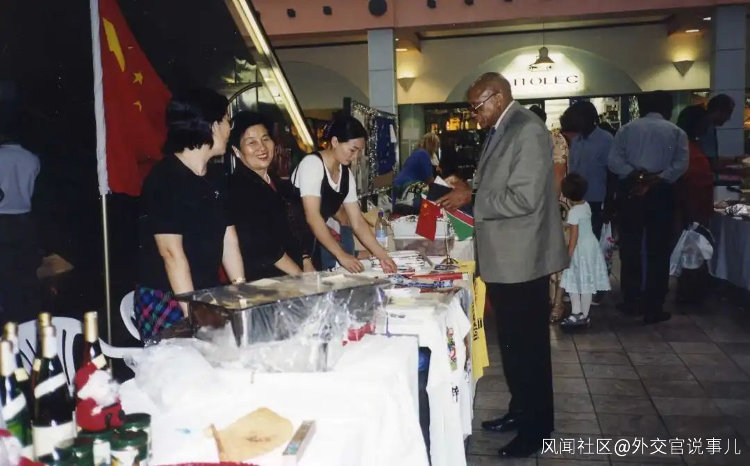 2001年11月18日,大使夫人李惠芳(中,微笑者)帶領使館外交官夫人們參加駐納米比亞外交團外交官夫人協會為當地艾滋病人捐款的義賣活動。