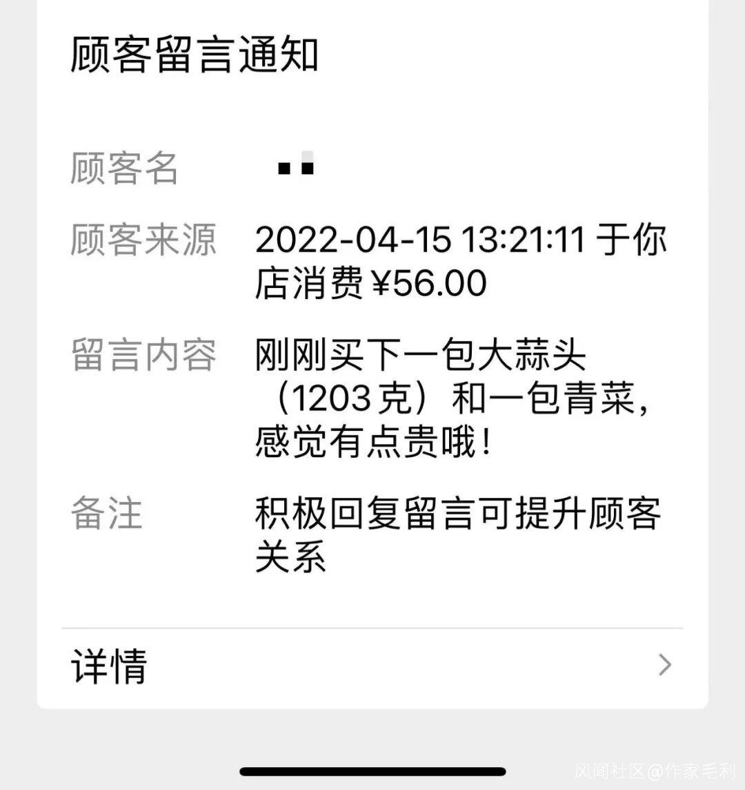 這時打開手機,發現有個顧客留下了貼心的羣眾意見:菜有點貴了。