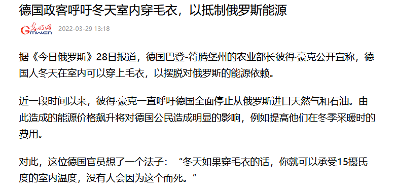 這次俄烏戰爭爆發以來,德國政府寧可自己的人民挨凍,也要堅決和美國站在同一陣線。甚至有德國官員聲稱,德國人通過拒絕吃肉,不用暖氣,在冬天穿毛衣的方式抵制俄羅斯。這樣離譜的言論立即印發了極大的不滿,德國國內甚至爆發了親俄遊行。
