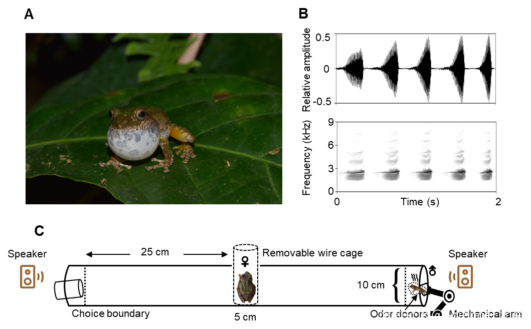 △(A) 一隻正在鳴叫的雄蛙,(B) 5音節廣告鳴叫的波形圖(上)和頻譜圖(下), (C) 實驗裝置示意圖。