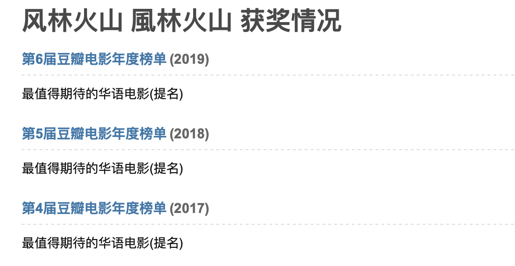 於是自2017年起,《風林火山》連續三年獲豆瓣電影年度榜單最值得期待的華語電影。