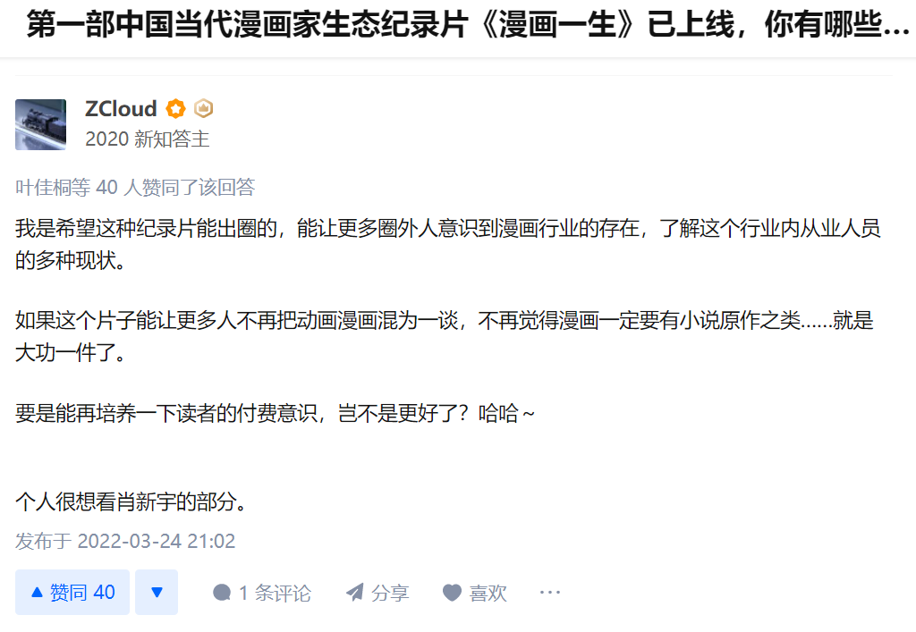 許多《漫畫一生》觀眾觀看後收穫的感想是,漫畫家“不容易”“辛苦”,甚至很“慘”。在社交平台評論中,有人還提出這樣的疑問:紀錄片裏談及了漫畫家的創作困境,他們都在盡力堅持,但反觀現實,為什麼當下中國漫畫市場作品質量還是參差不齊?