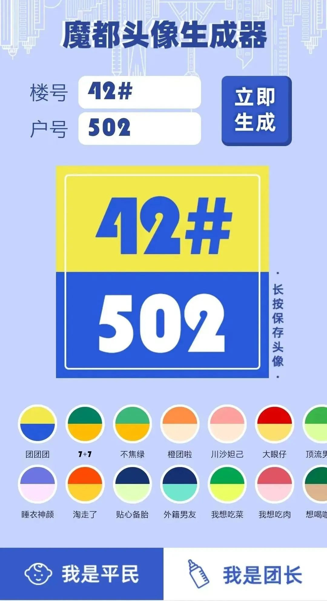 不難發現,頭像生成器中每一個配色下的文案描述,大部分都是與疫情相關的網絡流行梗。例如:“不焦綠”“橙團啦”“頂流男神”“川沙妲己”……