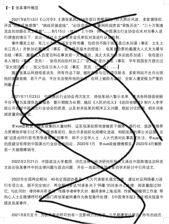 (7)2022年1月,李xue政被禁言後,張母的茶店客服通過微信朋友圈推薦了一個公眾號:張三堅。該公眾號約每週更新一篇文章,主要為分享讀書、觀影心得、人生感悟、吉他彈奏,偶爾會從專業角度分析演員的表演方法。此號被眾多張某的朋友、粉絲所推薦,最後於2022年4月被封禁。