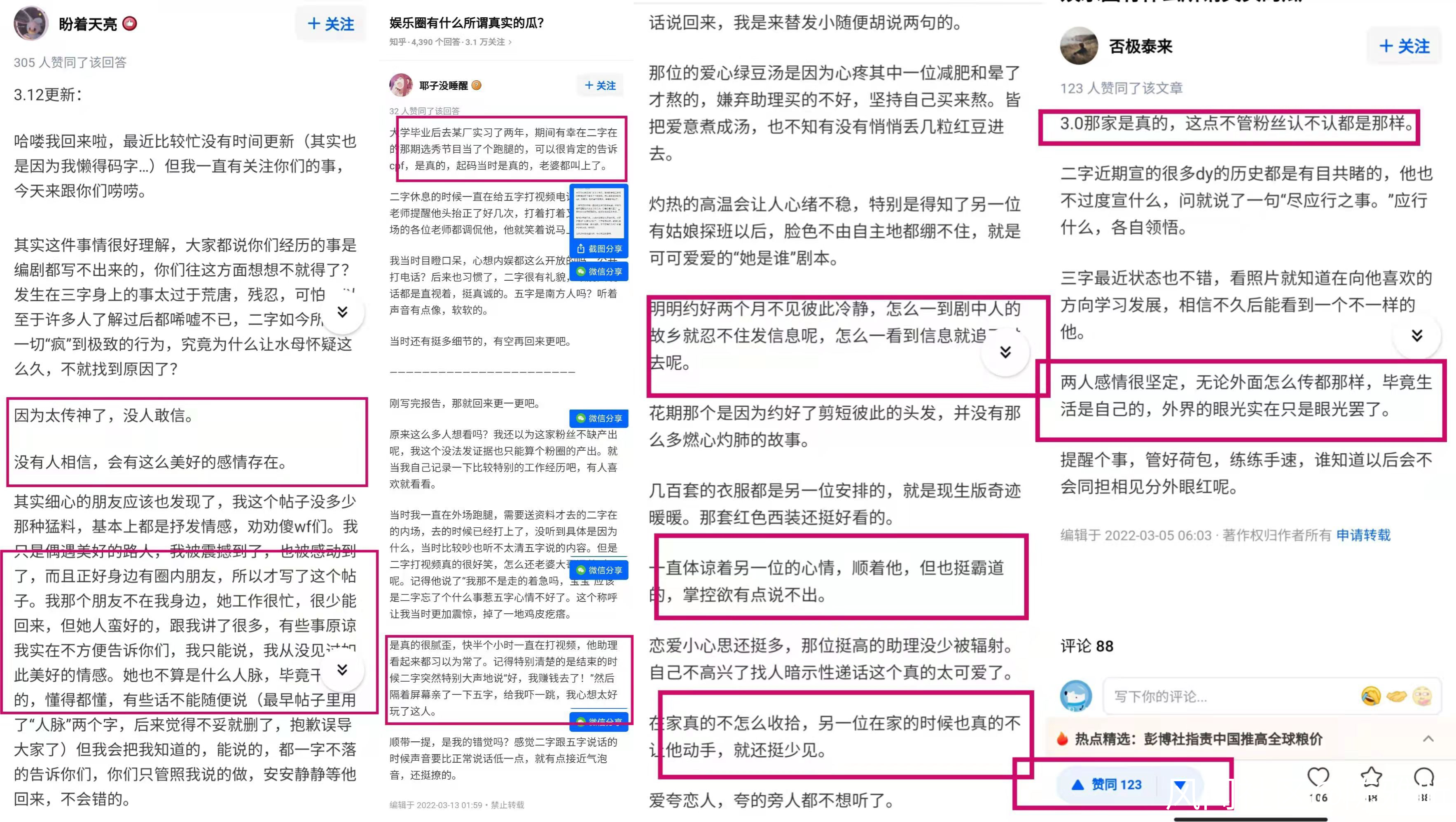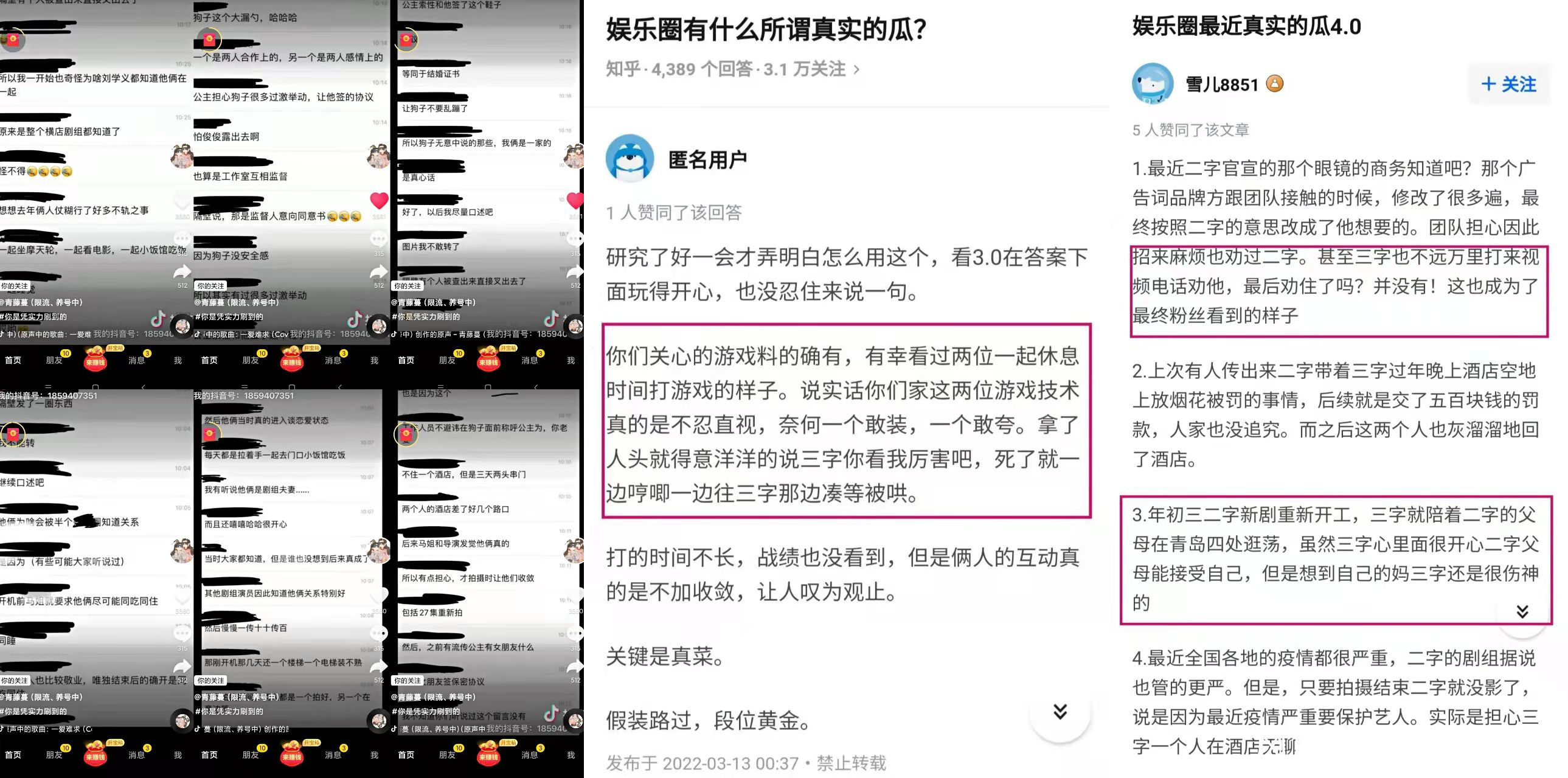 隨後各平台出現無數聲稱知道張某情況的人,全部為非實名賬號,覆蓋知乎、微博、抖音、B站、小紅書等各大平台,大量粉絲羣的羣主也自稱有內部消息。這些人被粉絲奉為“人脈”,在CP粉絲中佔據話語權,雖然他們從未給出過任何有效證據。