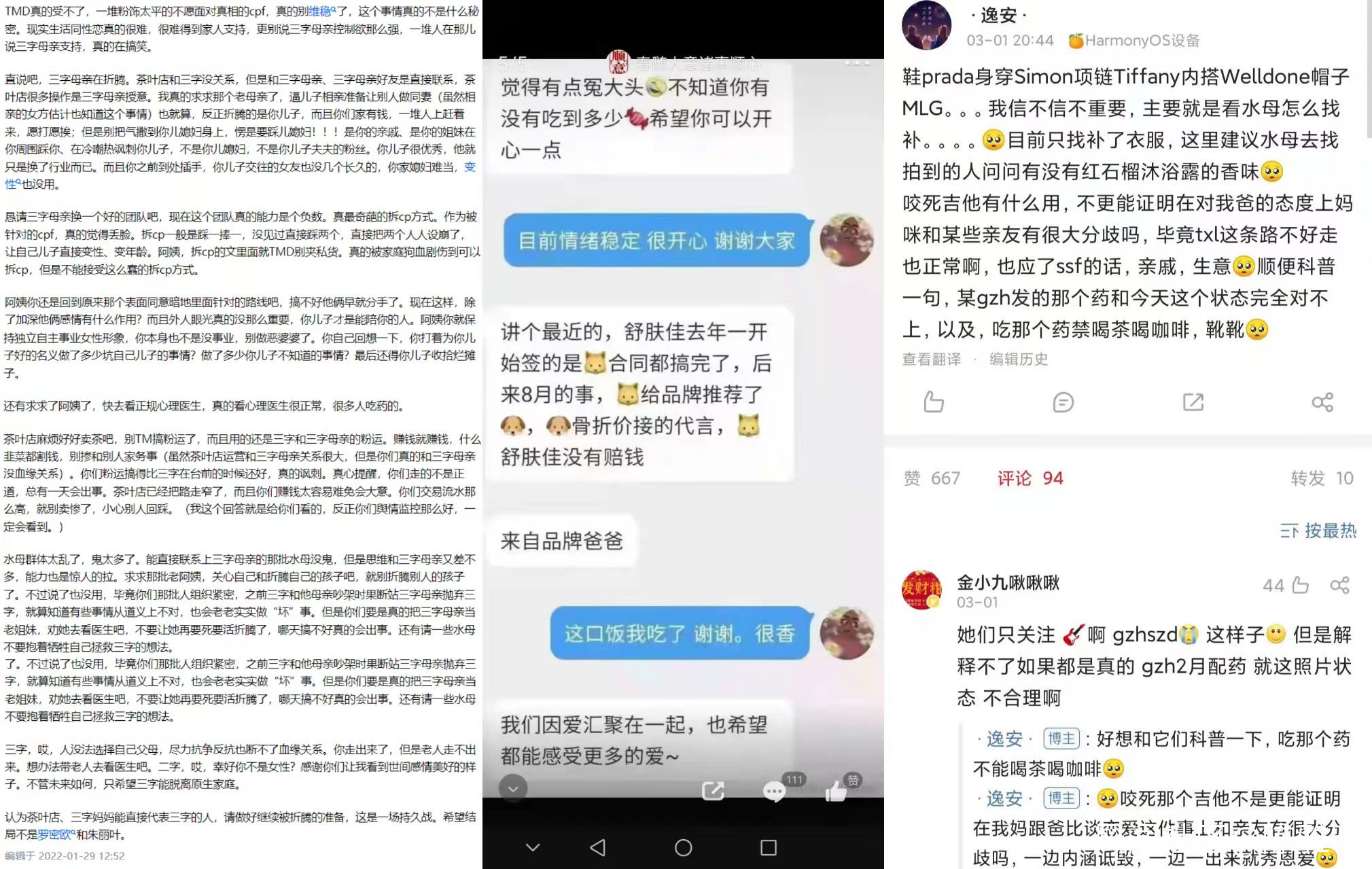 在這幾個月中,CP粉絲們則在(疑似)職業粉絲的引導下,對張某及相關人士持續進行網暴:極盡惡毒地辱罵張母及茶店合夥人、潮牌合夥人,攻擊所有認可潮牌、為張某發聲的有影響力的人士,攻擊公眾號“張三堅”,以文字獄的方式解讀、挑剔每一篇文章,辱罵公眾號裝病、賣慘、拆CP,並批量舉報公眾號。