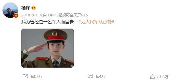 軍藝出身的楊洋一直有軍人情結,多次在建軍節發文為軍人們驕傲。