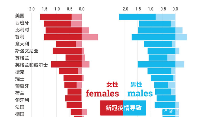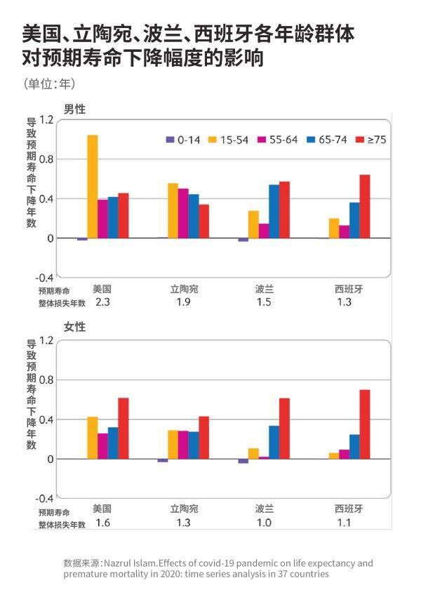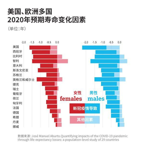 在美國、智利、英國、比利時、西班牙和斯洛文尼亞等國家,不論男性女性,人均預期壽命都因為新冠導致的死亡而下降了一年以上。而在丹麥、挪威等預期壽命上升的國家,研究者發現新冠導致的死亡被其他死因的下降所抵消。