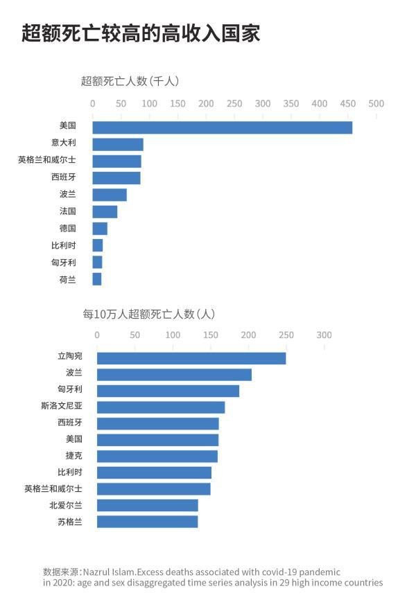 意大利、英國(僅英格蘭和威爾士地區)、西班牙2020年的超額死亡人數也都超8萬人。按每10萬人的指標來看,立陶宛、波蘭、匈牙利等國家每10萬人超額死亡人數分別達到250、204和187,在歐洲排名前三。