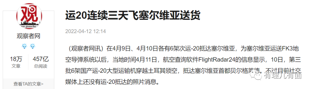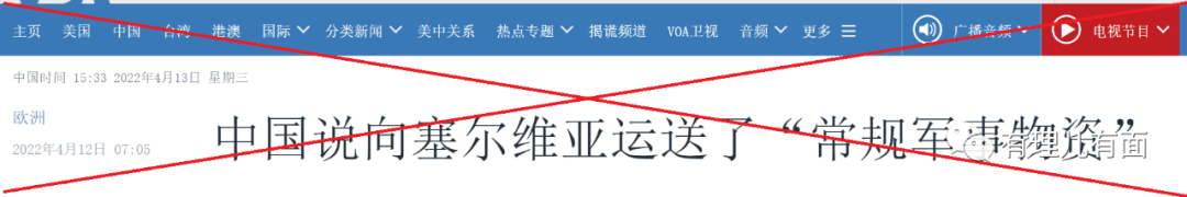 4月11日至12日,美國某音分別以“6架中國解放軍空軍運-20噴氣運輸機現身歐洲”和“中國説向塞爾維亞運送了常規軍事物資”為題,鼓譟稱中國這次行動會讓西方國家擔心在烏克蘭戰火肆虐的同時,巴爾幹地區的武器擴充可能會威脅到該地區和平。報道還稱,塞爾維亞和中國長期以來關係密切,這在一定程度上是出於兩國對華盛頓的共同不滿。因為塞爾維亞人對北約1999年在科索沃衝突期間發動的空襲心存怨恨。在那次空襲中,中國駐貝爾格萊德大使館被擊中。