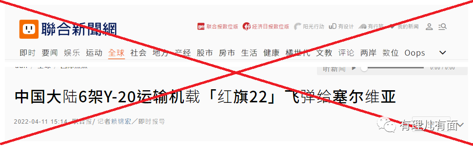 4月11日,台灣《科技新報》刊文稱,解放軍此時此舉,以罕見的6 機編隊飛行前往歐洲國家,意圖向歐美展示解放軍的戰略空運能量,並造謠説不排除透過塞爾維亞轉運戰爭物資給俄羅斯的可能。