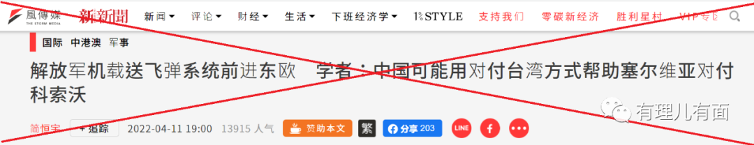 也在同一天,台灣《風傳媒》以“中國可能用對付台灣方式,幫助塞爾維亞對付科索沃”的大號標題,一邊酸溜溜地承認中國大陸戰略運輸能力的提升,一邊污衊造謠説中國願意介入科索沃問題、支持塞爾維亞對科索沃發動戰爭。