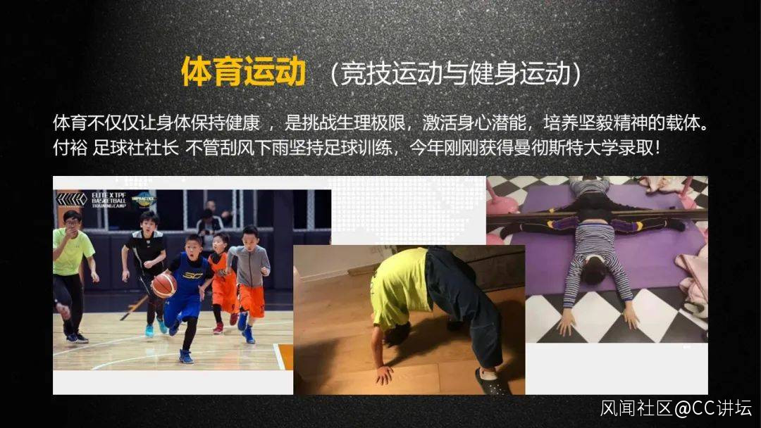 第二項跟大家推薦體育運動。運動不僅僅讓一個人身體健康,更重要的是它可以激活人的身心潛能,可以讓你挑戰自己的生理極限,為你鍛鍊一個堅毅的品質。我們學校有一名同學叫付裕,前不久剛剛拿到了英國名校,曼徹斯特大學的錄取。他的學習成績剛來的時候不是那麼好,但是這個孩子酷愛體育,熱愛足球,後來成立了足球社之後,他擔任社長,不管颳風下雨,每場訓練從來不落。有的同學説:哎呀,今天風這麼大,我們別去踢了。他説:足球比賽在風雨當中照常進行,為什麼不去,這不就是足球精神嗎?