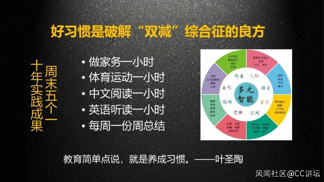 好習慣是破解“雙減”綜合徵的良方,週末五個一,就是我十年的實踐成果。做家務一小時,體育運動一小時,中文閲讀一小時,英語聽讀一小時,每週做一份總結,這五項既不是為了中考,也不是為了高考,而是為了什麼,一個終身學習的人,養成的這種習慣,