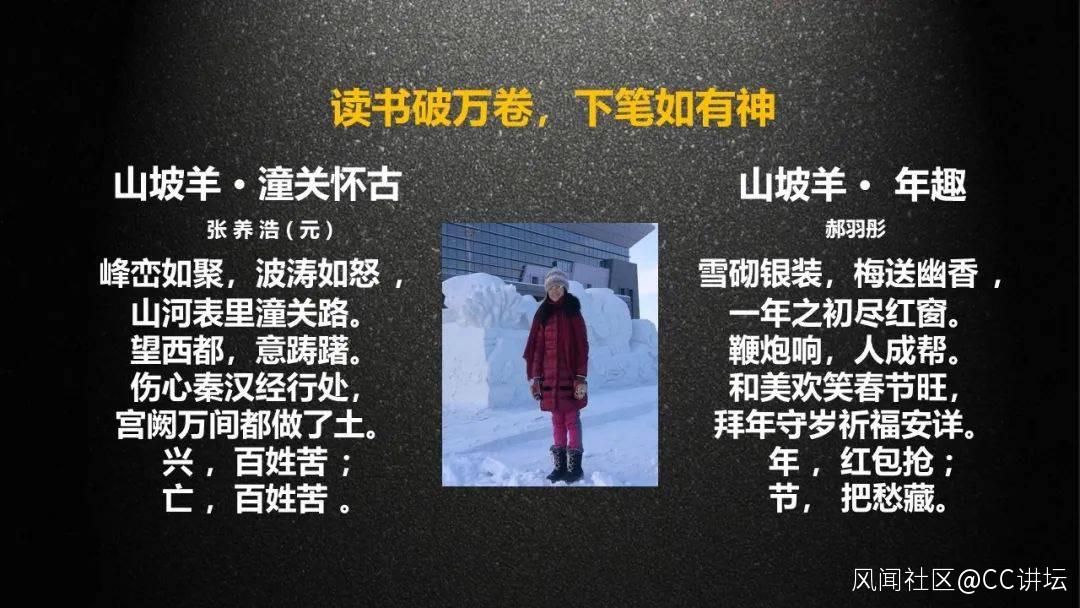 這是我女兒寫的《山坡羊•年趣》:雪砌銀裝,梅送幽香,一年之初盡紅窗。鞭炮響 人成幫,和美歡笑春節旺,拜年守歲祈福安詳。年,紅包搶;節,把愁藏。一個六年級的孩子,因為春節的時候參加冬令營,沒有回老家和爺爺奶奶一起過年,然後春天的時候能寫下這樣一首詞,我是非常佩服,我當年高考的時候,語文成績我們全校第一名,但是我寫不出來。
