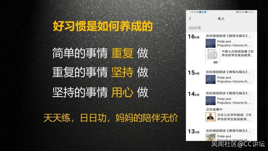 堅持是最難的事,怎麼堅持呢?天天練日日功,媽媽的陪伴無價。這是十天前我準備這個課件,我夫人的朋友圈的截圖,她給每天都在發我女兒,每天朗讀英文原版書的記錄,她已經堅持了兩千多天,所以我女兒能堅持。你不要指望孩子能堅持,一定是父母堅持陪伴着孩子才能堅持下來。