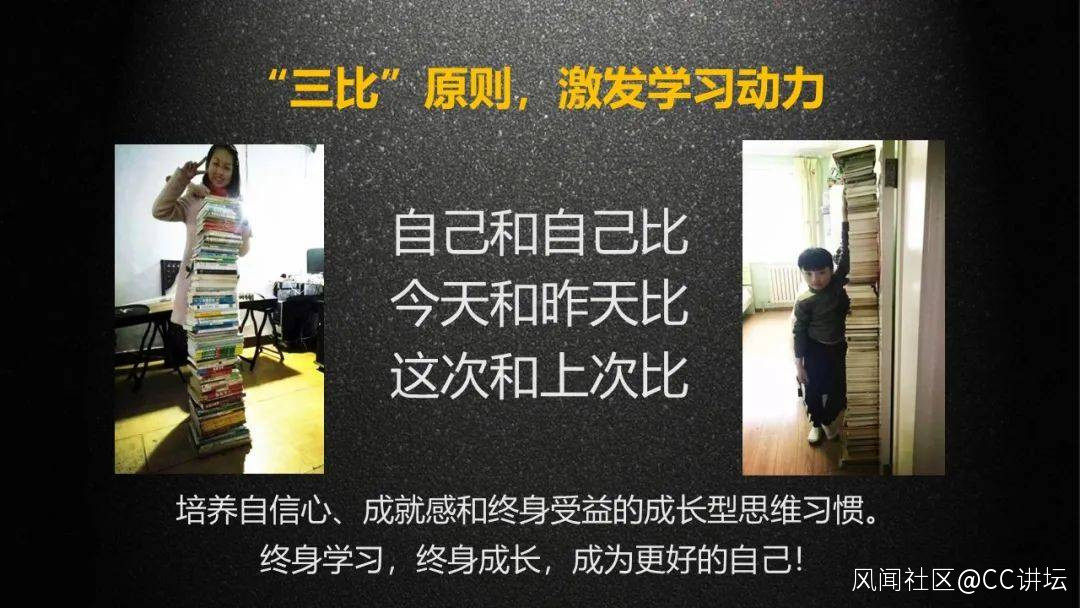 “三比”原則可以激發孩子的學習動力,讓好習慣的養成,在不知不覺中完成。一定要堅持“三比”原則,才可以給一個孩子持續的動力,就是自己和自己比,今天和昨天比,這次和上次比。當孩子看到每年讀過的書,自己跟着比比個的時候,那種幸福感,你跟那些沒讀過書的孩子能一樣嗎?不可能。