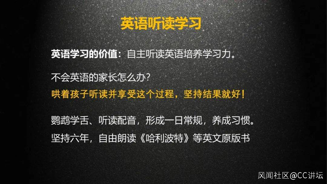 有人説:我也不會英語啊,我怎麼陪我的孩子學英語啊?我説:你不會英語,正好,你可以跟孩子當同學,就是哄着孩子聽讀,跟他一起來聽讀,並且享受這個過程,只要堅持就有結果。
