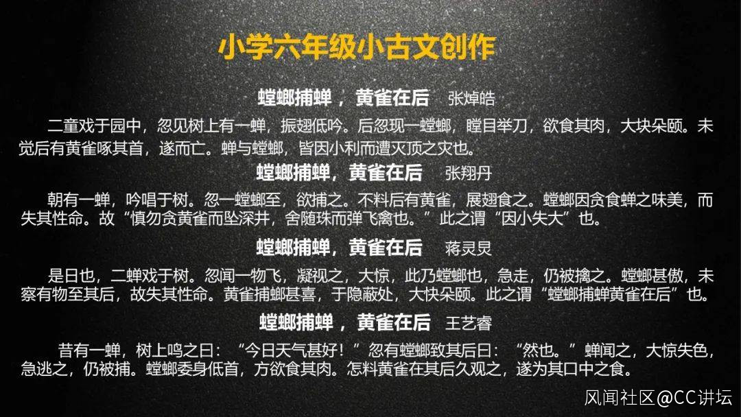 什麼叫創造力?我們的很多孩子,讀經誦典五六萬字之後,文言文的語感就形成了,最後他們就能用文言文的方式,來創編小古文。螳螂捕蟬 黃雀在後的故事,我們每個人用現代漢語都能講,看看孩子們的創造力,每一個人的語言表達方式都不一樣。所以我就説,一個孩子讀書破萬卷以後,下筆的時候,就有神來之筆,非常非常羨慕他們。