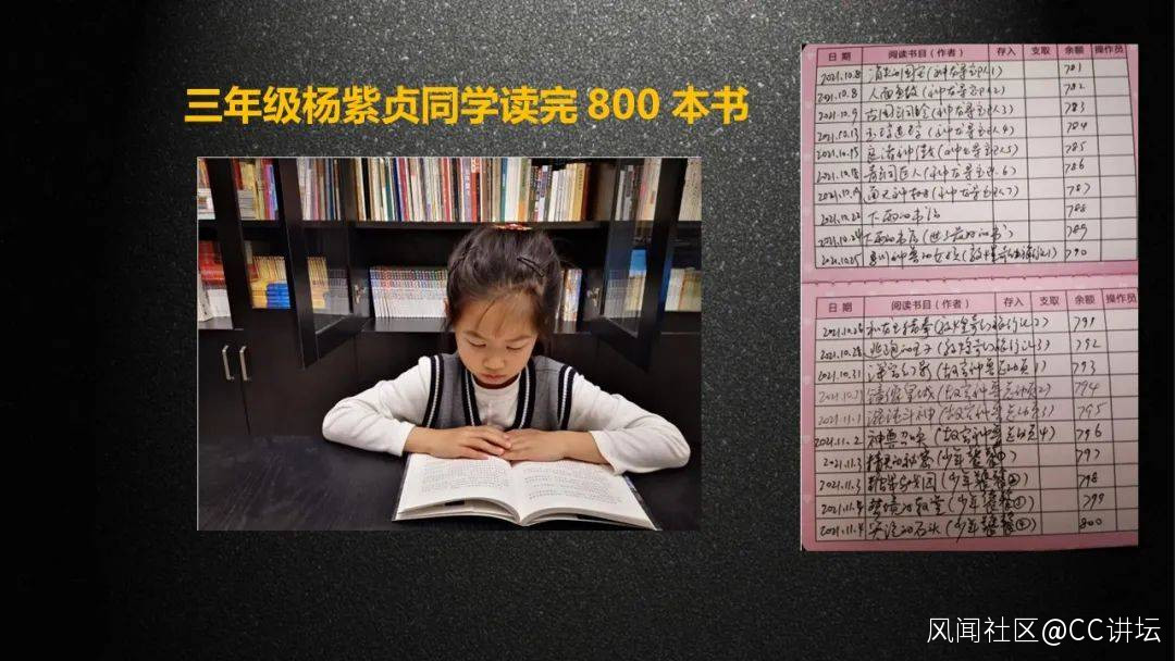 三年級的楊紫貞同學,已經讀完了800本書。去年十一月四日,爸爸把這張閲讀存摺拍了照片,發給班主任裴老師,裴老師非常開心,發給了我,説道:道道爸爸非常支持學校海量閲讀的理念,認認真真地給孩子每天的閲讀做了記錄,當看着一本本書在增加的時候,家長內心很開心。我們三月份是文明月,在文明月升旗儀式上,這個孩子的發言非常淡定,非常大度,所以我説讀書多的孩子,他講話的時候叫什麼?有料!
